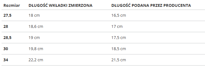 RozmiarDŁUGOŚĆ WKŁADKI ZMIERZONADŁUGOŚĆ PODANA PRZEZ PRODUCENTA