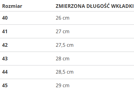 | Rozmiar | ZMIERZONA DŁUGOŚĆ WKŁADKI [CM] |