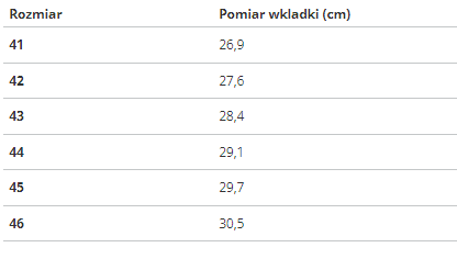 | Rozmiar | Pomiar wkladki (cm) |