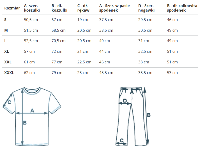| Rozmiar | A -szer. koszulki | B - dł. koszulki | C - dł. rękaw | A - Szer. w pasie spodenek | D - Szer. nogawki | B - dł. całkowita spodenek |