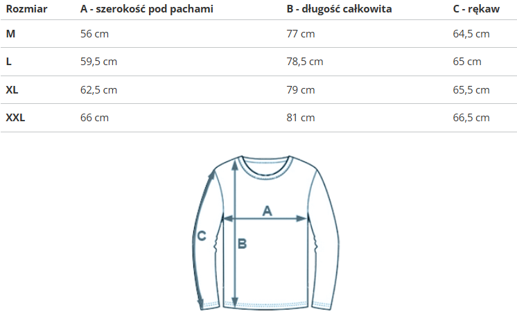 | Rozmiar | A - szerokość pod pachami | B - długość całkowita | C - rękaw |