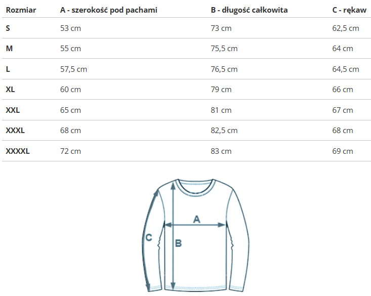 | Rozmiar | A - szerokość pod pachami | B - długość całkowita | C - rękaw |