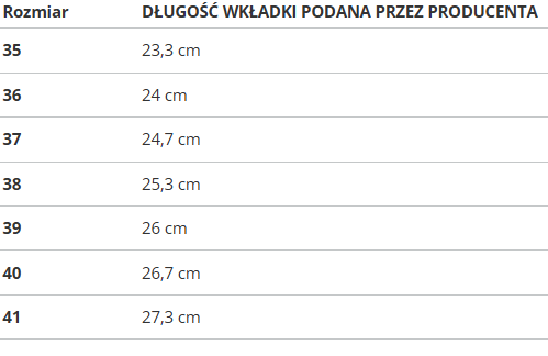 | Rozmiar | DŁUGOŚĆ WKŁADKI PODANA PRZEZ PRODUCENTA |