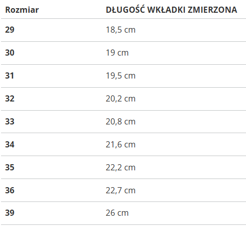 Rozmiar | DŁUGOŚĆ WKŁADKI ZMIERZONA |