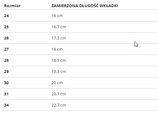 | Rozmiar | ZAMIERZONA DŁUGOŚĆ WKŁADKI |