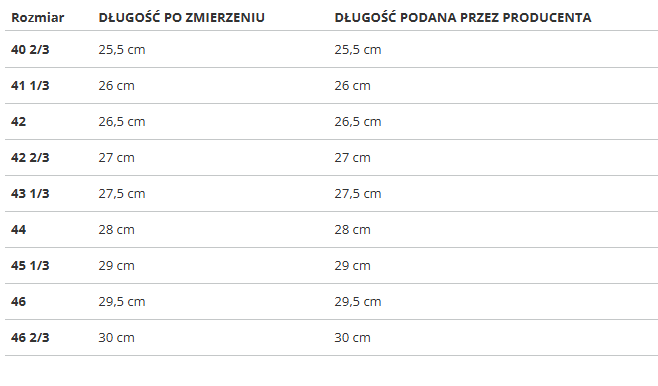 | Rozmiar | DŁUGOŚĆ PO ZMIERZENIU | DŁUGOŚĆ PODANA PRZEZ PRODUCENTA |