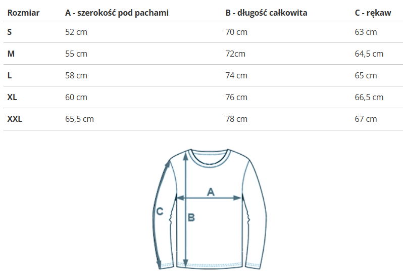 | Rozmiar | A - szerokość pod pachami | B - długość całkowita | C - rękaw |
