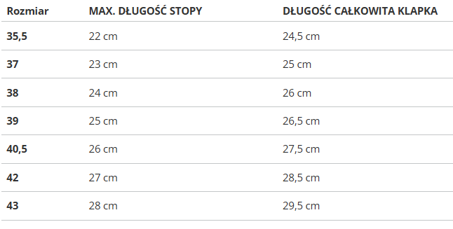 | Rozmiar | MAX. DŁUGOŚĆ STOPY | DŁUGOŚĆ CAŁKOWITA KLAPKA |