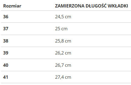 | Rozmiar | ZAMIERZONA DŁUGOŚĆ WKŁADKI |
