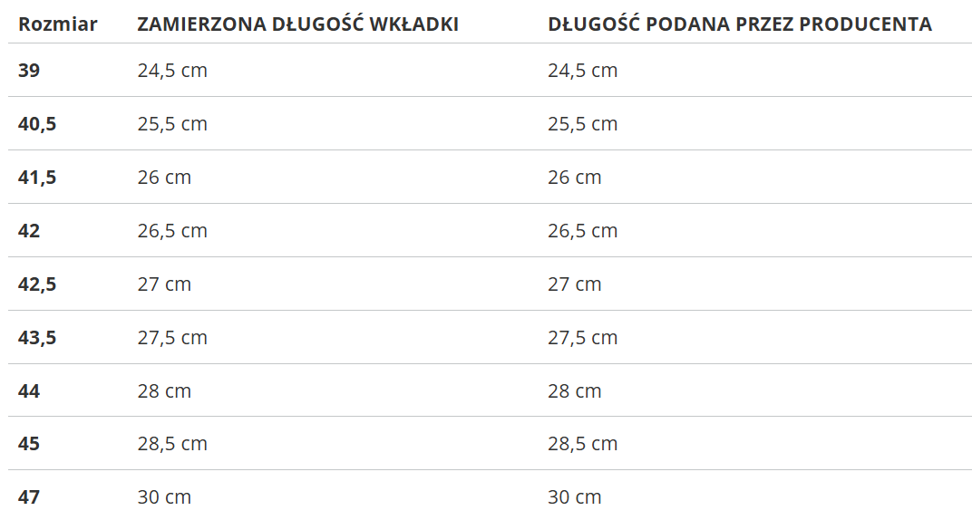| Rozmiar | ZAMIERZONA DŁUGOŚĆ WKŁADKI | DŁUGOŚĆ PODANA PRZEZ PRODUCENTA |