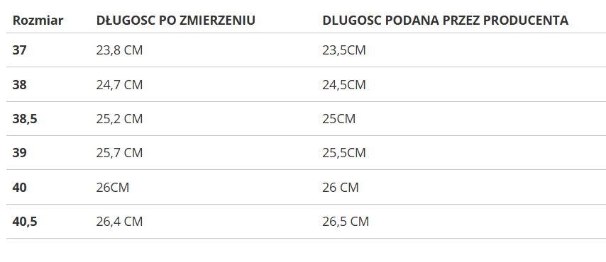 Rozmiar | DŁUGOSC PO ZMIERZENIU | DLUGOSC PODANA PRZEZ PRODUCENTA |