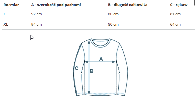 | Rozmiar | A - szerokość pod pachami | B - długość całkowita | C - rękaw |