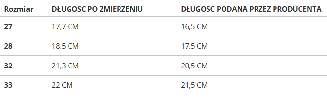 Rozmiar | DŁUGOSC PO ZMIERZENIU | DŁUGOSC PODANA PRZEZ PRODUCENTA |