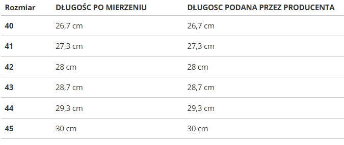 Rozmiar | DŁUGOŚC PO MIERZENIU | DŁUGOSC PODANA PRZEZ PRODUCENTA |