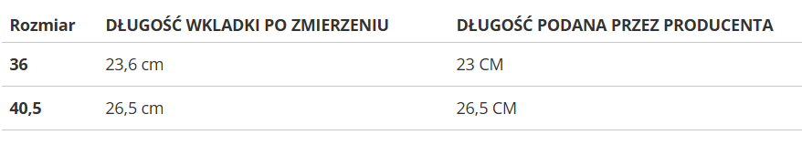 RozmiarDŁUGOŚĆ WKLADKI PO ZMIERZENIUDŁUGOŚĆ PODANA PRZEZ PRODUCENTA