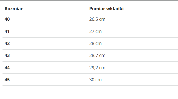 | Rozmiar | Pomiar wkladki |