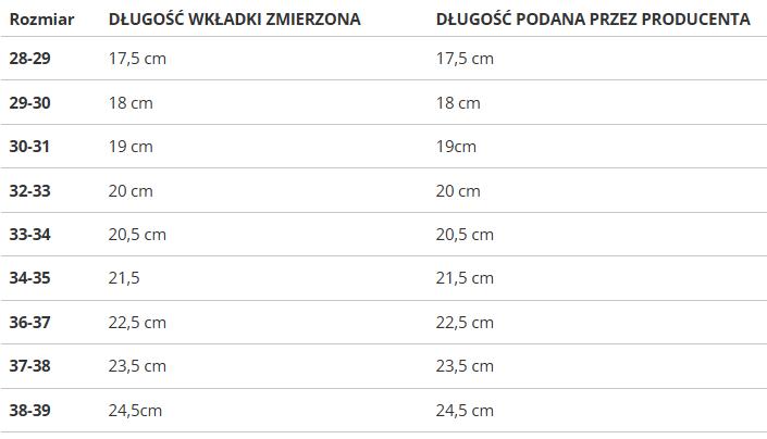 Rozmiar | DŁUGOŚĆ WKŁADKI ZMIERZONA | DŁUGOŚĆ PODANA PRZEZ PRODUCENTA |