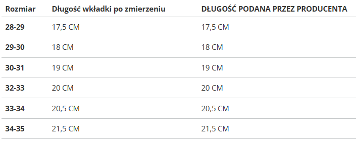 Rozmiar | Długość wkładki po zmierzeniu | DŁUGOŚĆ PODANA PRZEZ PRODUCENTA |