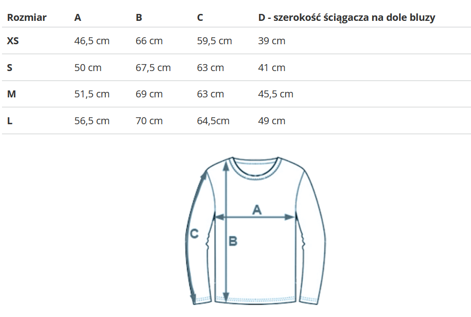 Rozmiar | A | B | C | D - szerokość ściągacza na dole bluzy |