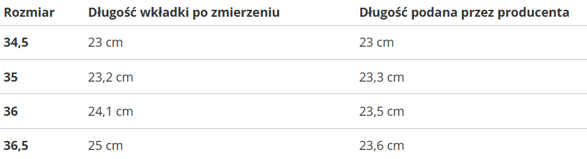 Rozmiar | Długość wkładki po zmierzeniu | Długość podana przez producenta |