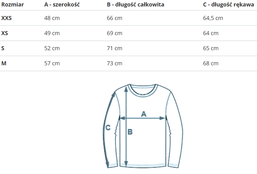 RozmiarA - szerokośćB - długość całkowitaC - długość rękawa