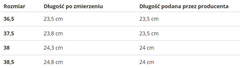 Rozmiar | Długość po zmierzeniu | Długość podana przez producenta |