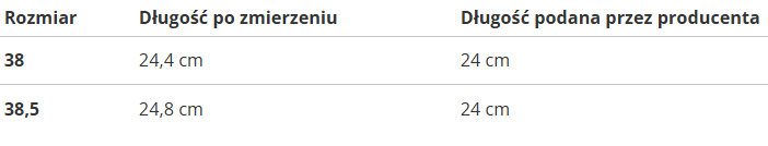 | Rozmiar | Długość po zmierzeniu | Długość podana przez producenta |