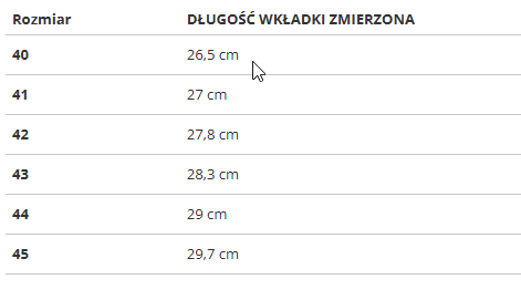RozmiarDŁUGOŚĆ WKŁADKI ZMIERZONA