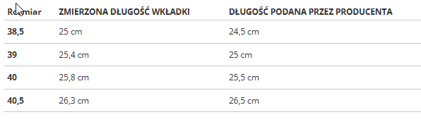 Rozmiar | ZMIERZONA DŁUGOŚĆ WKŁADKI | DŁUGOŚĆ PODANA PRZEZ PRODUCENTA |