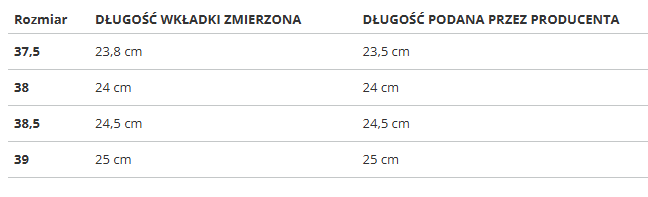 Rozmiar | DŁUGOŚĆ WKŁADKI ZMIERZONA | DŁUGOŚĆ PODANA PRZEZ PRODUCENTA |