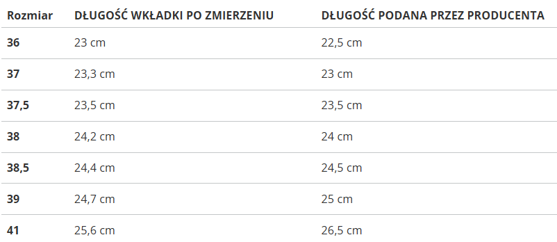 Rozmiar | DŁUGOŚĆ WKŁADKI PO ZMIERZENIU | DŁUGOŚĆ PODANA PRZEZ PRODUCENTA |