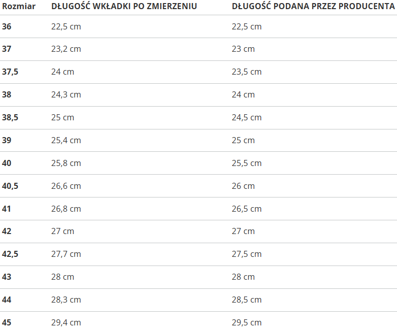 Rozmiar | DŁUGOŚĆ WKŁADKI PO ZMIERZENIU | DŁUGOŚĆ PODANA PRZEZ PRODUCENTA |