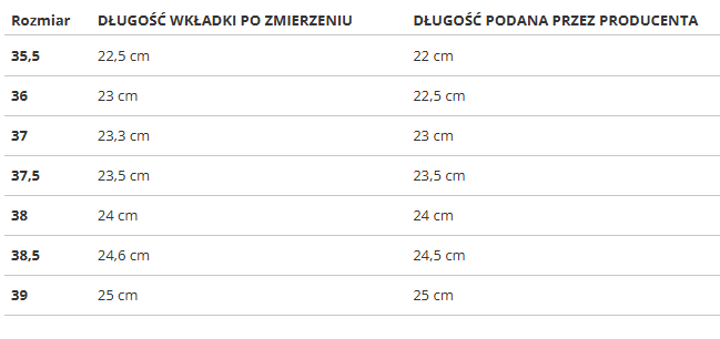 Rozmiar | DŁUGOŚĆ WKŁADKI PO ZMIERZENIU | DŁUGOŚĆ PODANA PRZEZ PRODUCENTA |