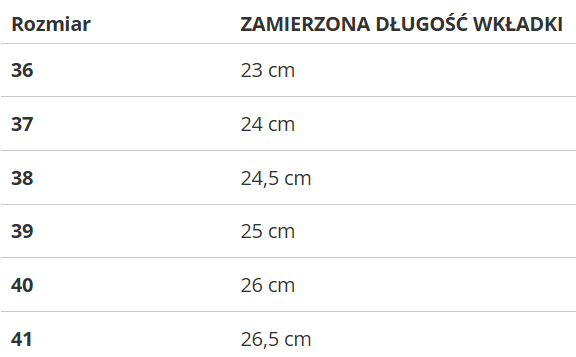 RozmiarZAMIERZONA DŁUGOŚĆ WKŁADKI