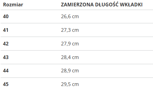 RozmiarZAMIERZONA DŁUGOŚĆ WKŁADKI