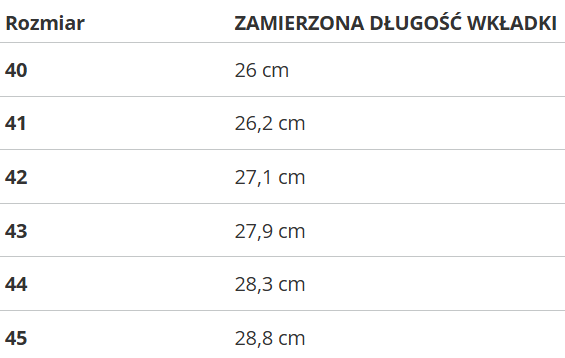 RozmiarZAMIERZONA DŁUGOŚĆ WKŁADKI