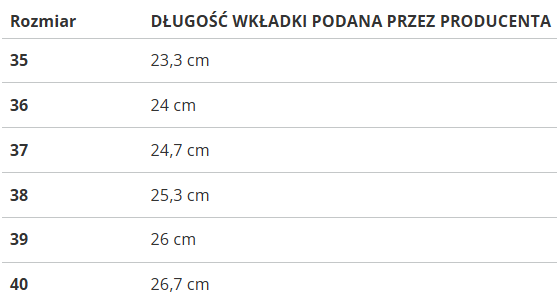 RozmiarDŁUGOŚĆ WKŁADKI PODANA PRZEZ PRODUCENTA