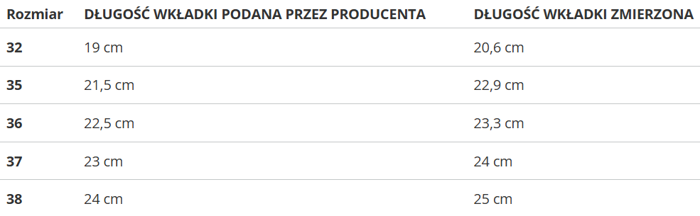 | Rozmiar | DŁUGOŚĆ WKŁADKI PODANA PRZEZ PRODUCENTA | DŁUGOŚĆ WKŁADKI ZMIERZONA |