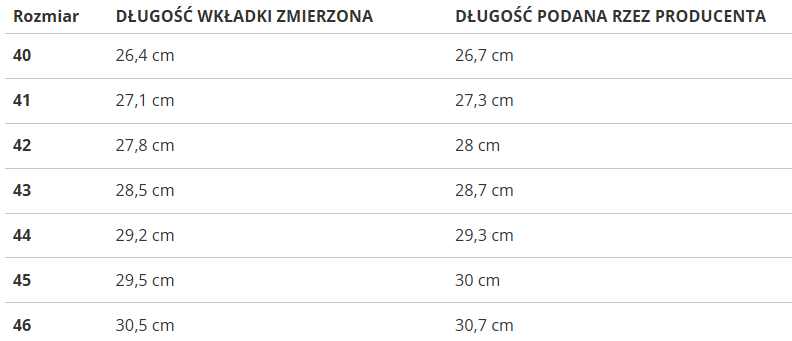 | Rozmiar | DŁUGOŚĆ WKŁADKI ZMIERZONA | DŁUGOŚĆ PODANA RZEZ PRODUCENTA |