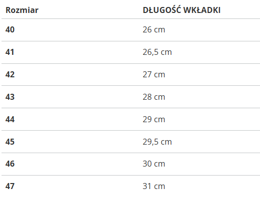 | Rozmiar | DŁUGOŚĆ WKŁADKI |