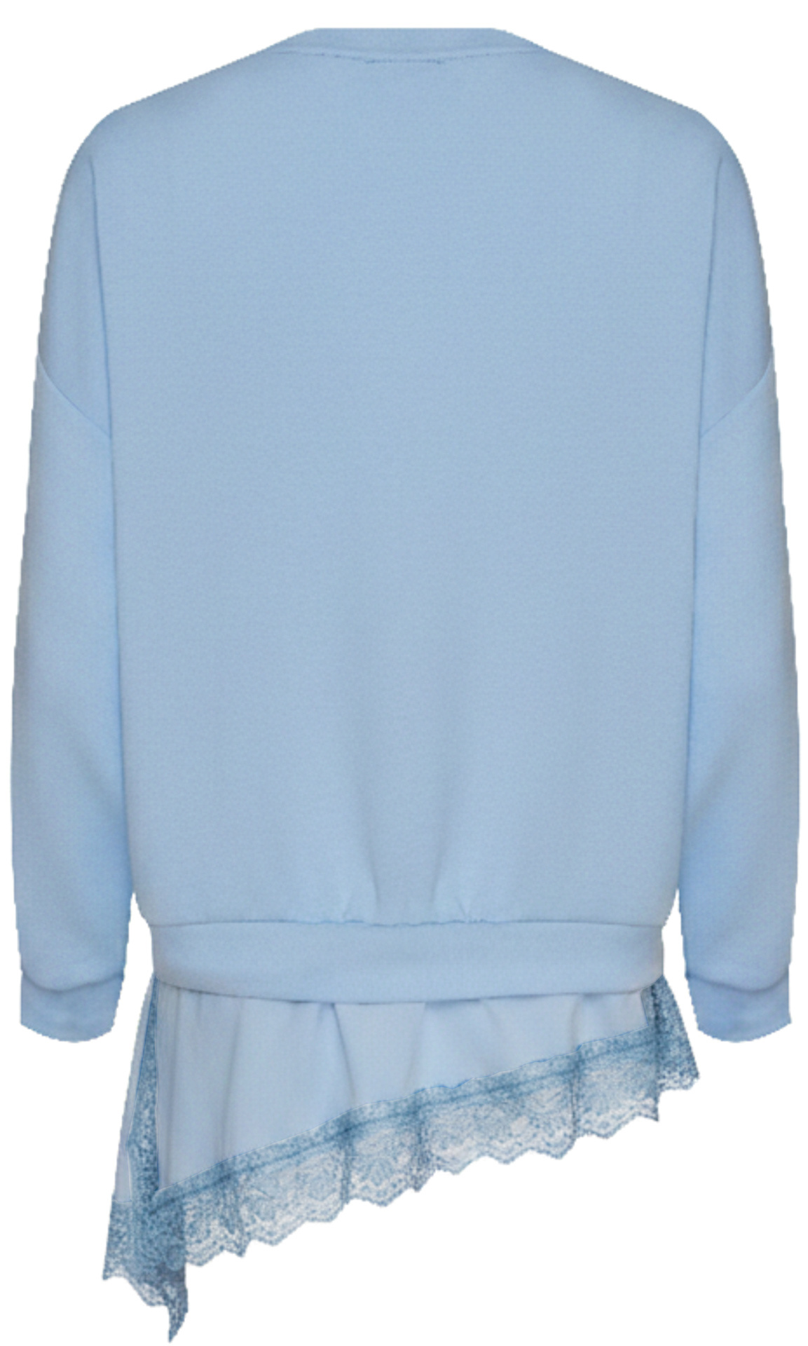 - Asymetryczna halka wszyta u dołu bluzy zakończona koronką delikatnie wystaje spod niej, tworząc efekt warstwowy i dodając stylizacji lekkości oraz elegancji.